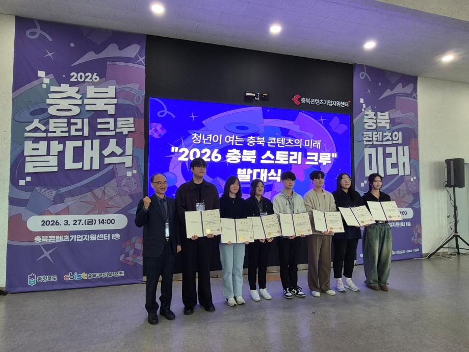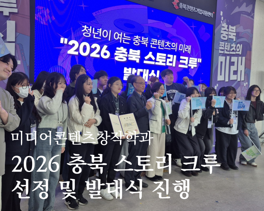 본문 시작 홈으로 MCC News 학과소개 교수소개 학과과정 MCC News MCC SNS 홈페이지가이드 학과 및 재학생 학과 및 재학생 교수 및 졸업생 미디어 정보통 학과 및 재학생 페이스북 트위터 프린트 2026 충북 스토리 크루 선정 및 발대식 진행 미디어콘텐츠창작학과 250 2026-03-28 충북과학기술혁신원에서 주최하는 2026 충북 스토리 크루(콘텐츠 청년 연구단)에 세명대학교 미디어콘텐츠창작학과가 선정되어 지도교수 및 학생들이 발대식에 참여하였습니다. 목록 다음 제14회 24시간 필름 페스티벌 담당부서 : 미디어콘텐츠창작학과 담당자 : - 연락처 : 043-649-1741 최종수정일 : 2024-10-26 만족도조사 만족도 조사 이 페이지에서 제공하는 정보에 대하여 만족하시나요? 매우만족 만족 보통 불만족 매우불만족
